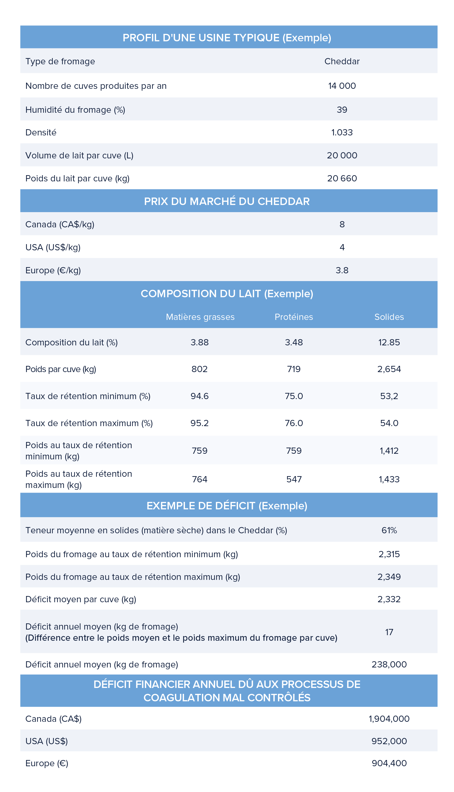 Les calculs financiers ci-dessous ont été effectués sur la base des résultats et conclusions de l’étude réalisée par Agriculture et Agroalimentaire Canada (Centre de RD AAC à Saint-Hyacinthe, QC, Canada). Les calculs financiers ci-dessous visent à simuler les économies qu’une usine de grande taille pourrait générer sur une année si le taux de rétention des matières grasses, des protéines et des solides est optimisé grâce à un meilleur contrôle de la fermeté au tranchage du caillé.